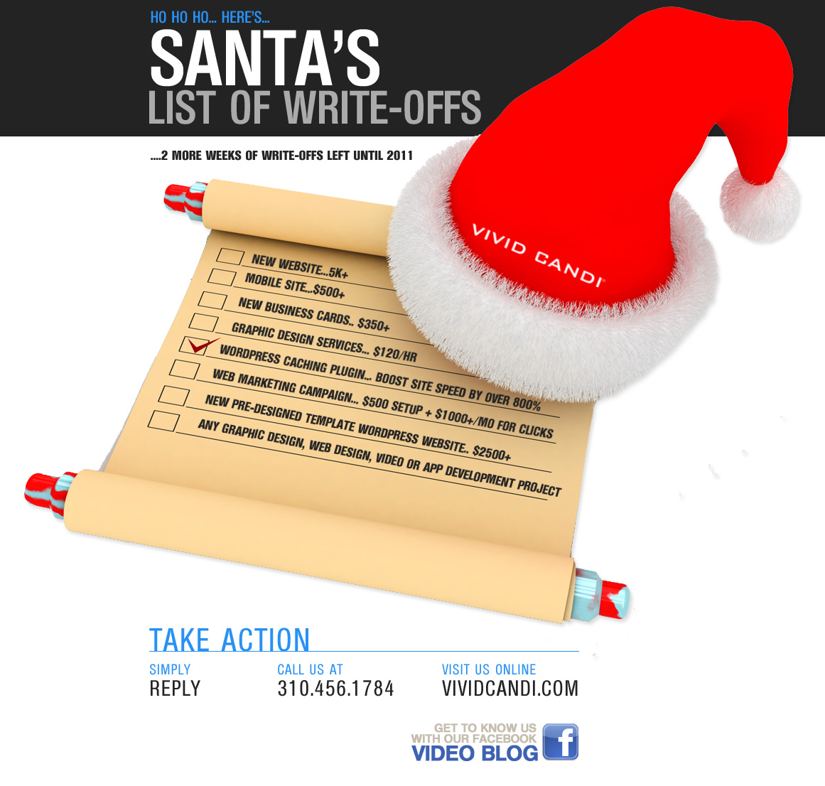 It’s the end of the year and your business now has a choice…. spend more money on services your business needs before January 1st, 2011 and pay less taxes or just pay taxes and get nothing beneficial for your business. Too bad there can’t be just one year of free taxes. Either way, It’s a simple choice… we recommend you make the most of it. The perfect use of these write-offs is marketing… invest in a new website, a new branding, new graphic design work, etc. to create new business for the next year.