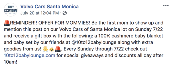 Another impactful way to market your car dealership is collaborating with brands that have similar goals or target audiences as your car dealership. We recently had Volvo of Santa Monica collaborate with our other client, 10 to 12 Baby Lounge, a store also targeting Moms in LA.