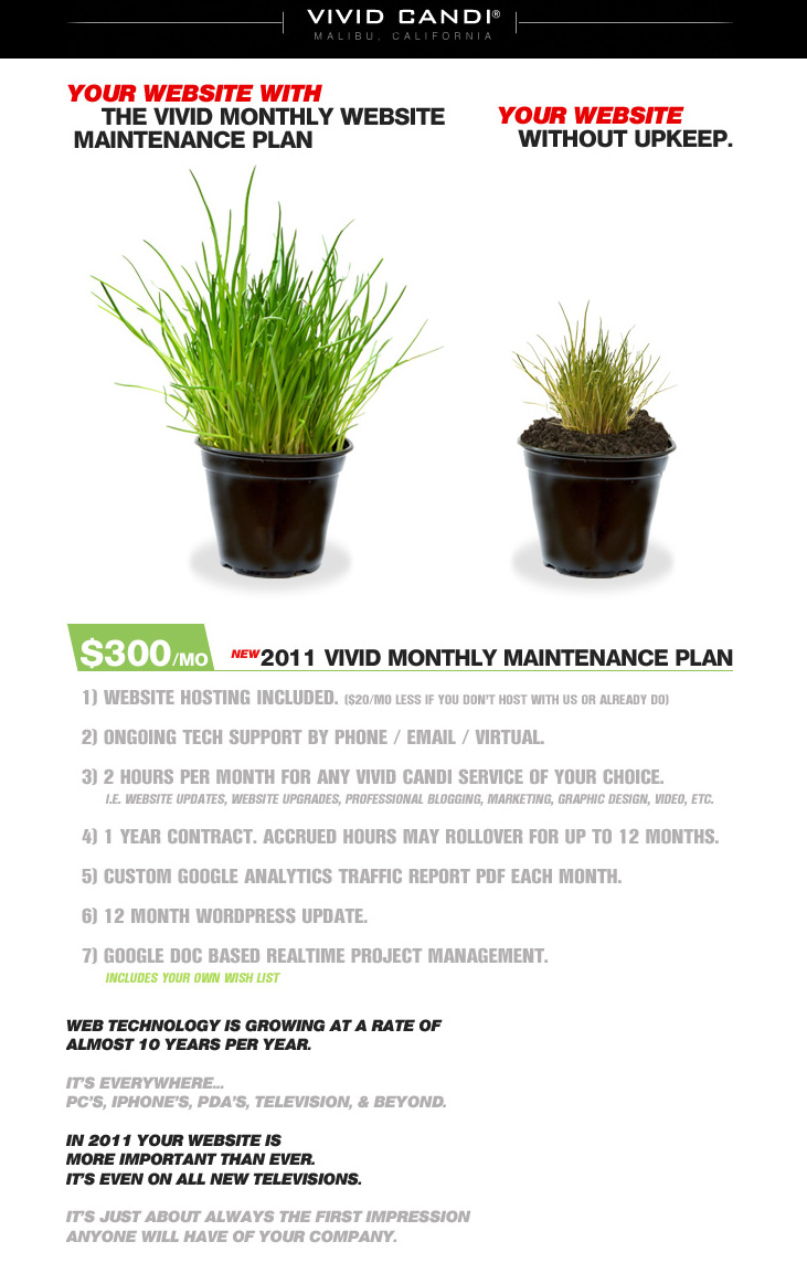 Vivid Candi is a full service digital agency located in Malibu, California located about twenty minutes away from downtown Los Angeles. As a full service digital agency, Vivid Candi can help you with all of your website management needs. This will include web hosting, website development, optimizing and editing your website design, measuring traffic and full time assistance for all of your other various needs. Vivid Candi’s monthly maintenance plan starts at 300$ per month. Included in this website management and website maintenance service, is a custom monthly report of Google analytics for website traffic, expert recommendations based on review of traffic, and a 12 month WordPress update. Vivid Candi specializes in both website management and website design for both large and small businesses in the Los Angeles area. If you want Vivid Candi as your webmaster contact us by phone at 310.456.1784 or visit our website at www.vc.vividcandi.net.